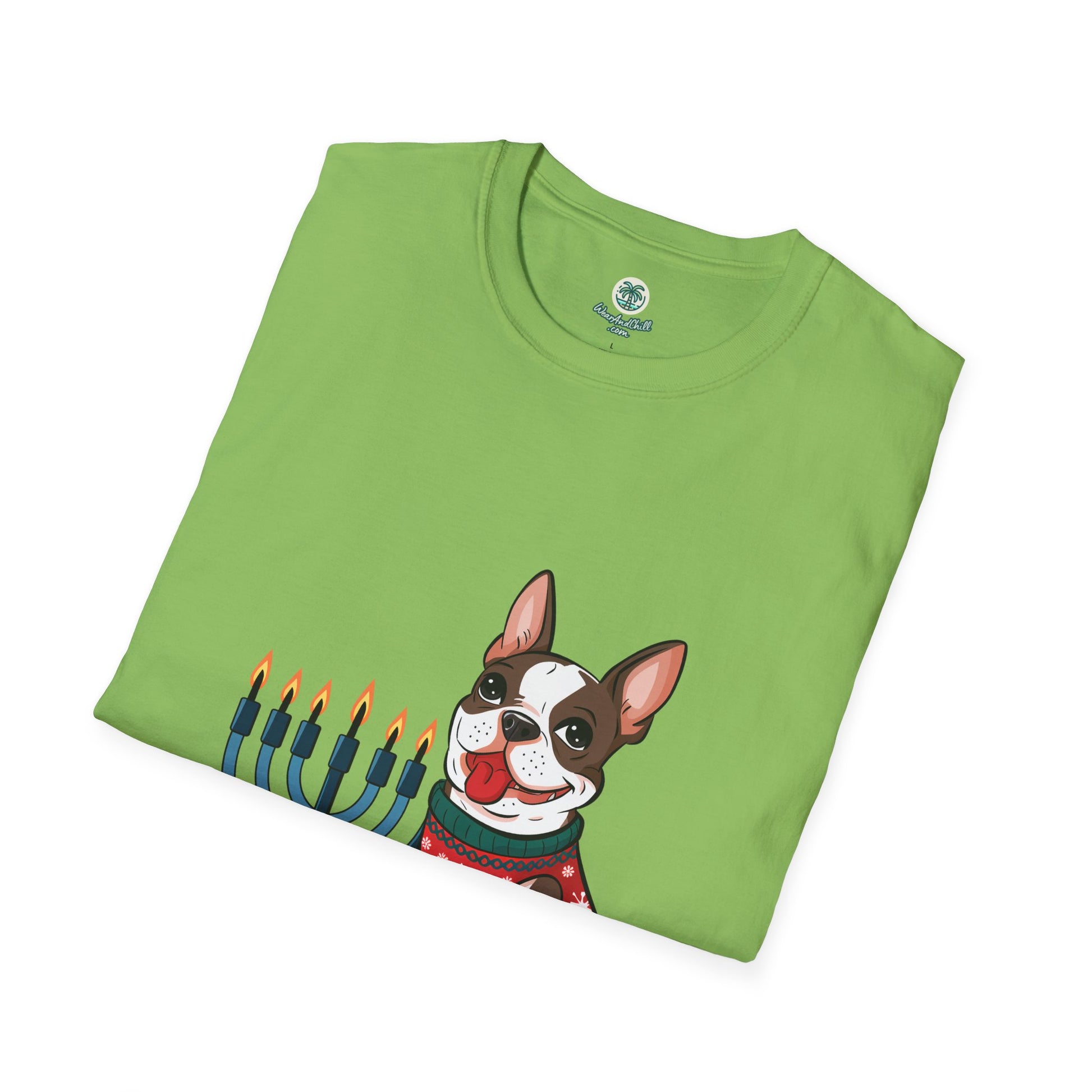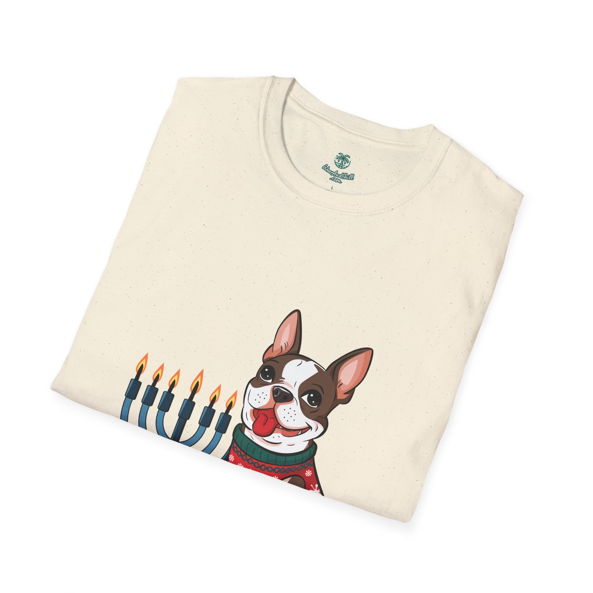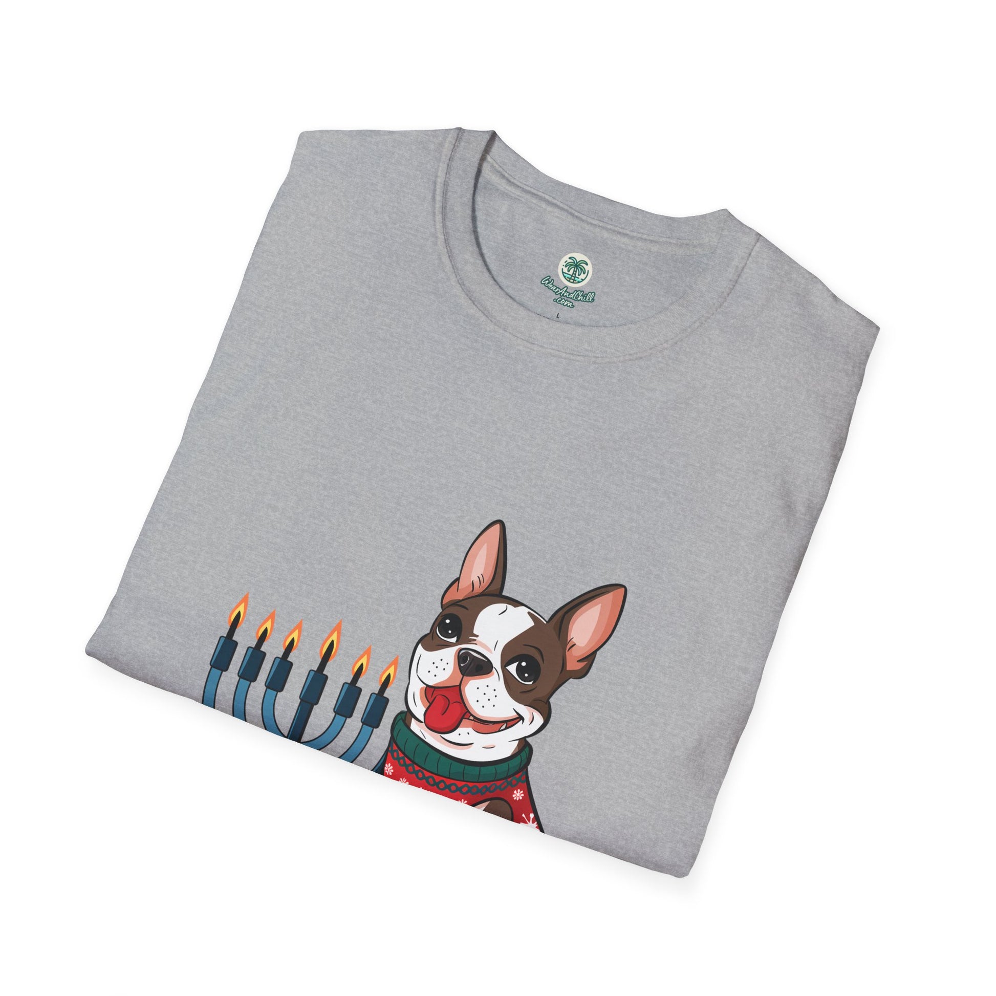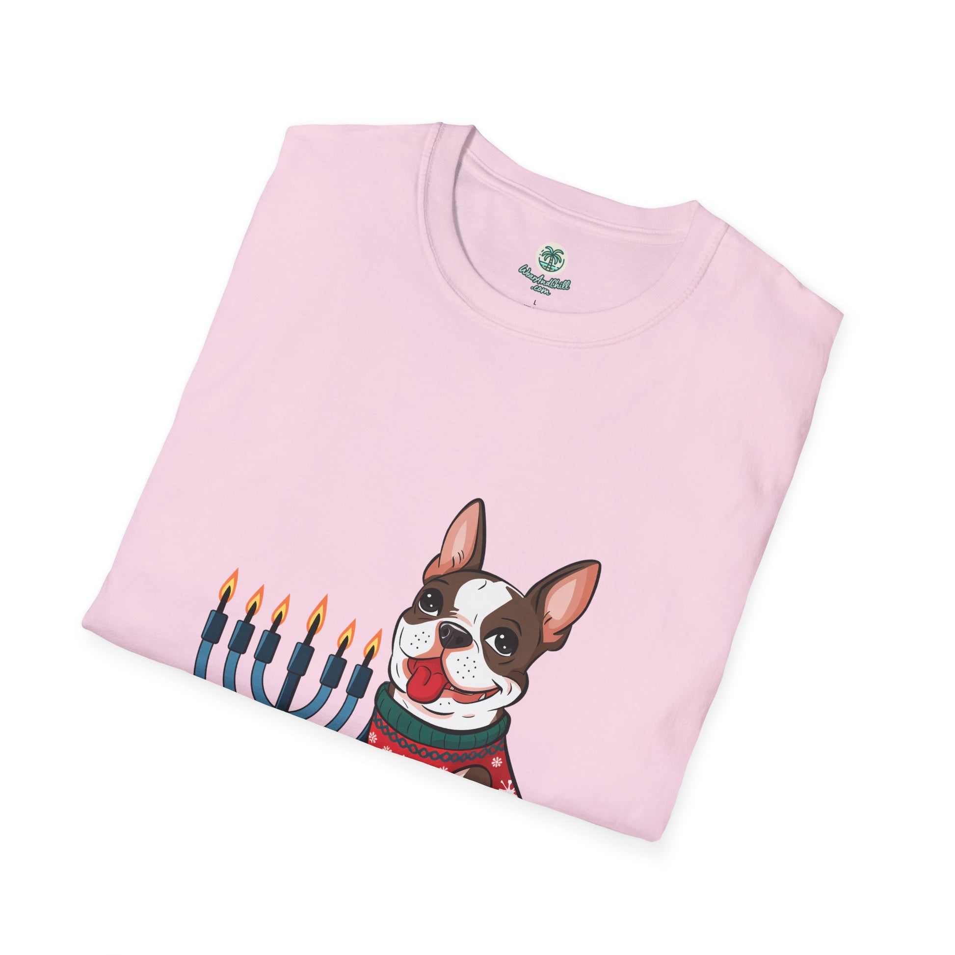 Unleash joy and festivity with our "A Cheerful Boston Terrier and a Menorah" T-shirt from the exclusive Christmas & Dogs Collection. This charming tee celebrates the holiday spirit with a vibrant design featuring an adorable Boston Terrier paired perfectly with a glowing menorah. Crafted from premium cotton, it promises a comfortable fit and stands as the perfect gift for dog lovers and celebrators alike. With its unique and festive theme, this shirt is sure to be a conversation starter at any gathering. Embrace the magic of the season, and let your style shine bright!