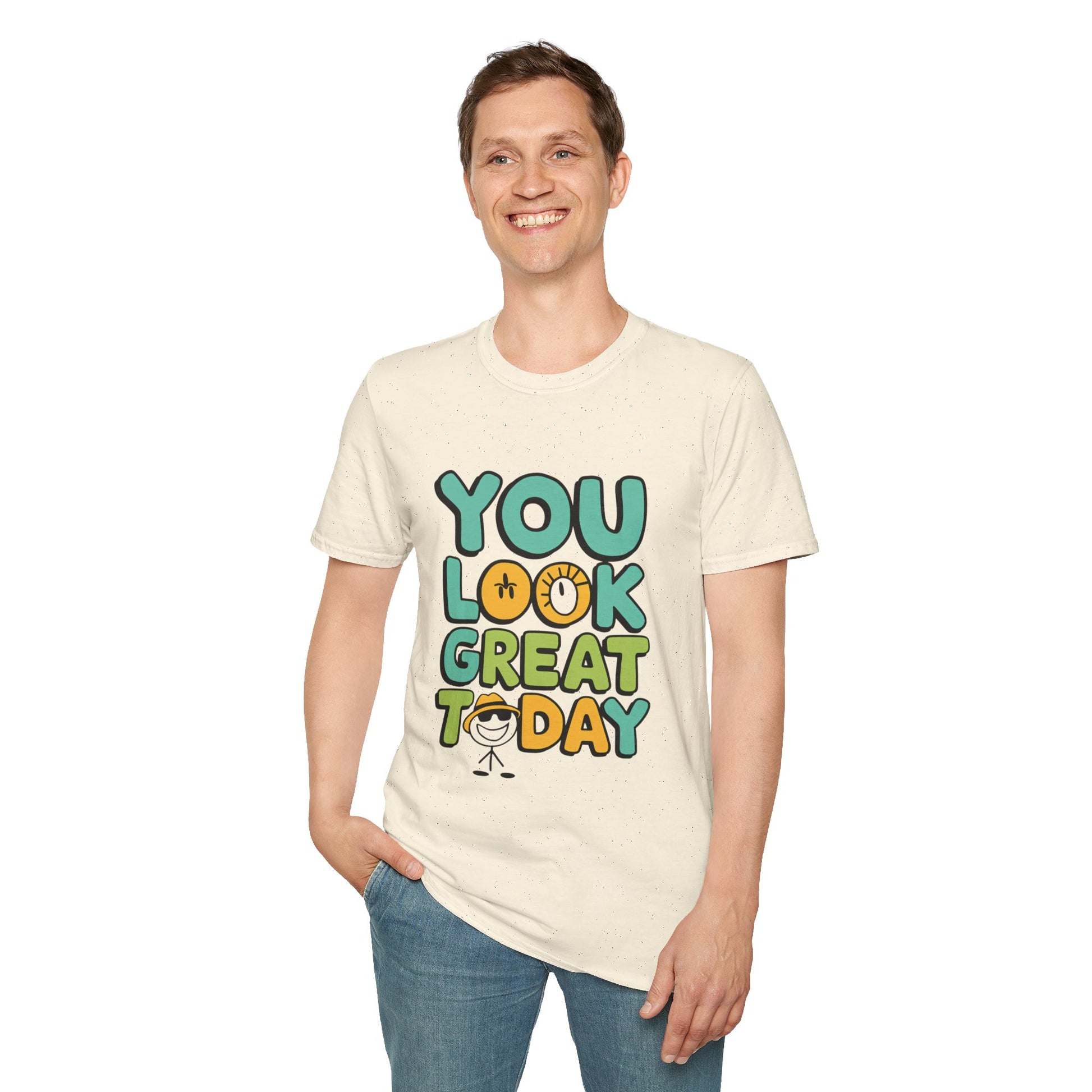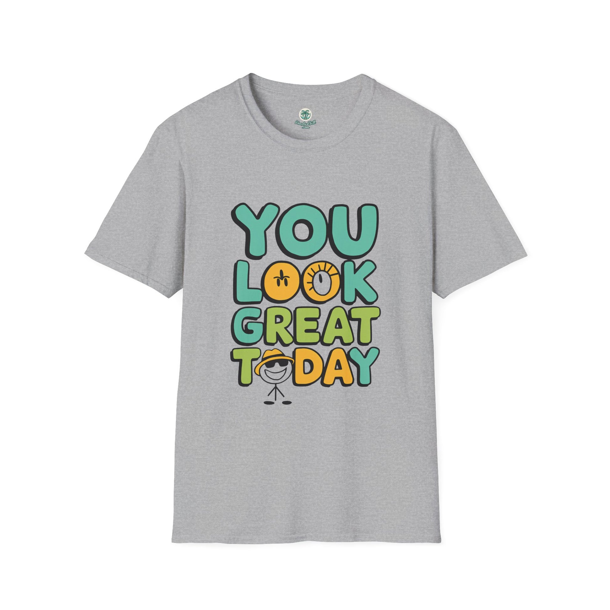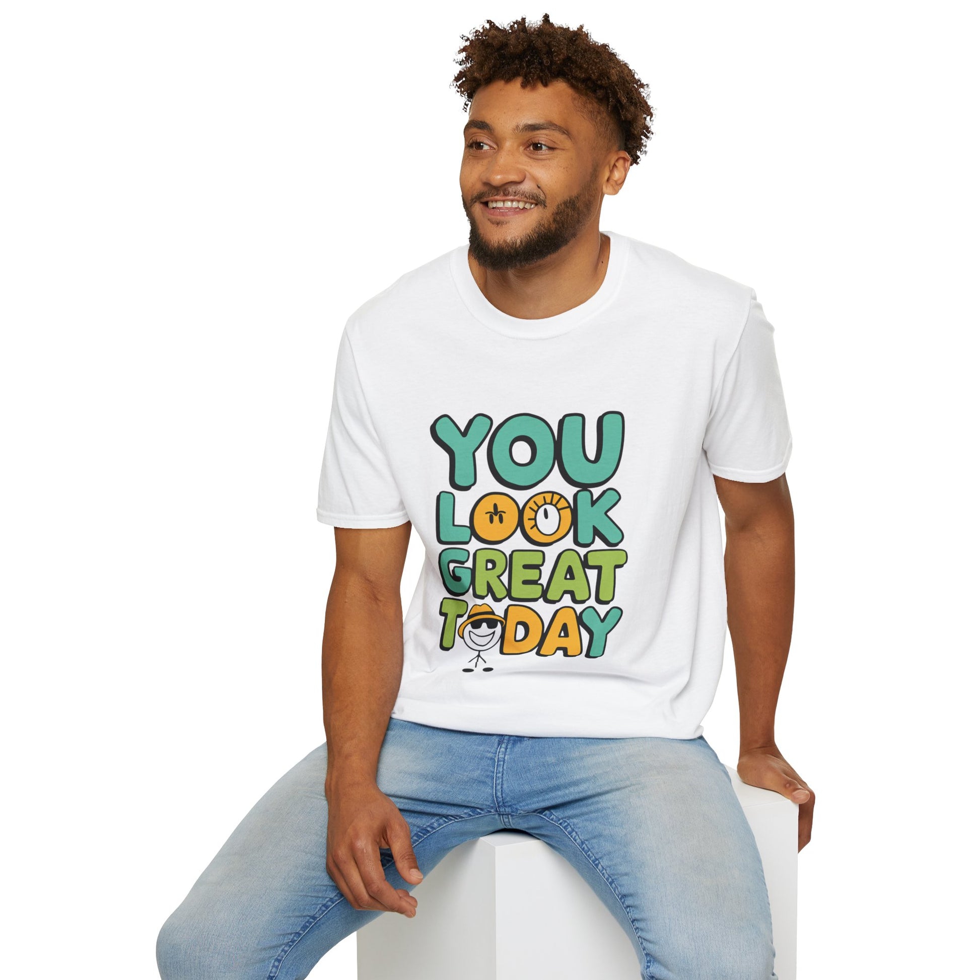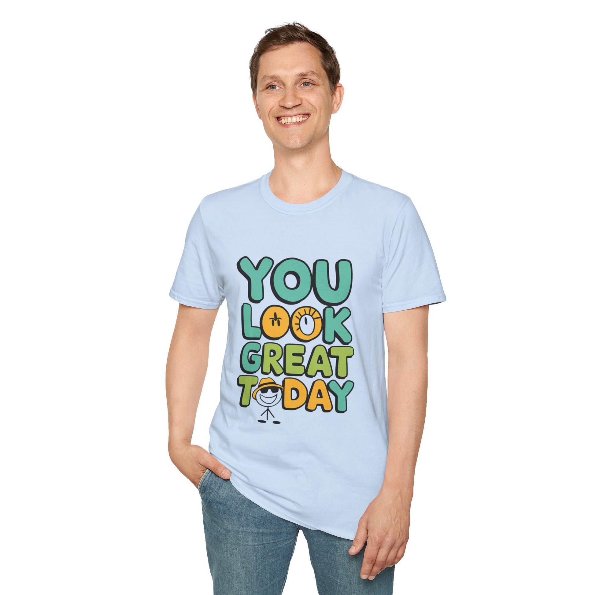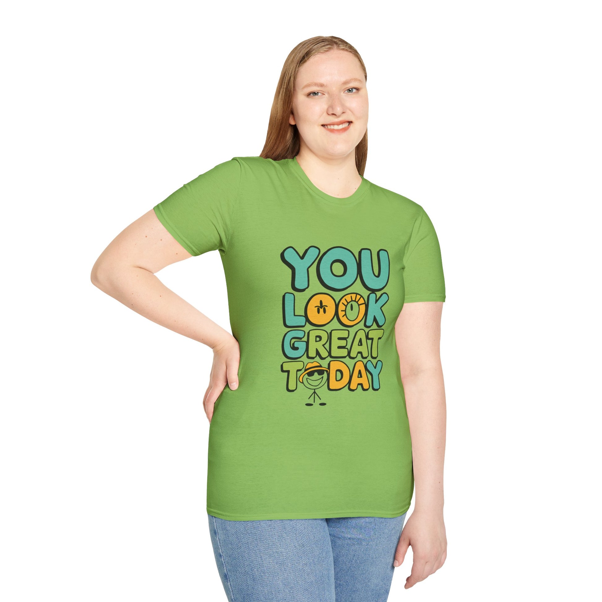 Elevate your everyday wardrobe with our "You Look Great Today" White Lie T-Shirt. This comfy, casual tee is made from soft, breathable cotton, perfect for those effortless, laid-back vibes. Featuring the playful and positive message, "You Look Great Today," it's sure to bring a smile to everyone's face. Ideal for casual outings or just lounging at home, this stylish and versatile shirt is a must-have addition to your collection. Spread a little joy and confidence wherever you go with this charming tee!